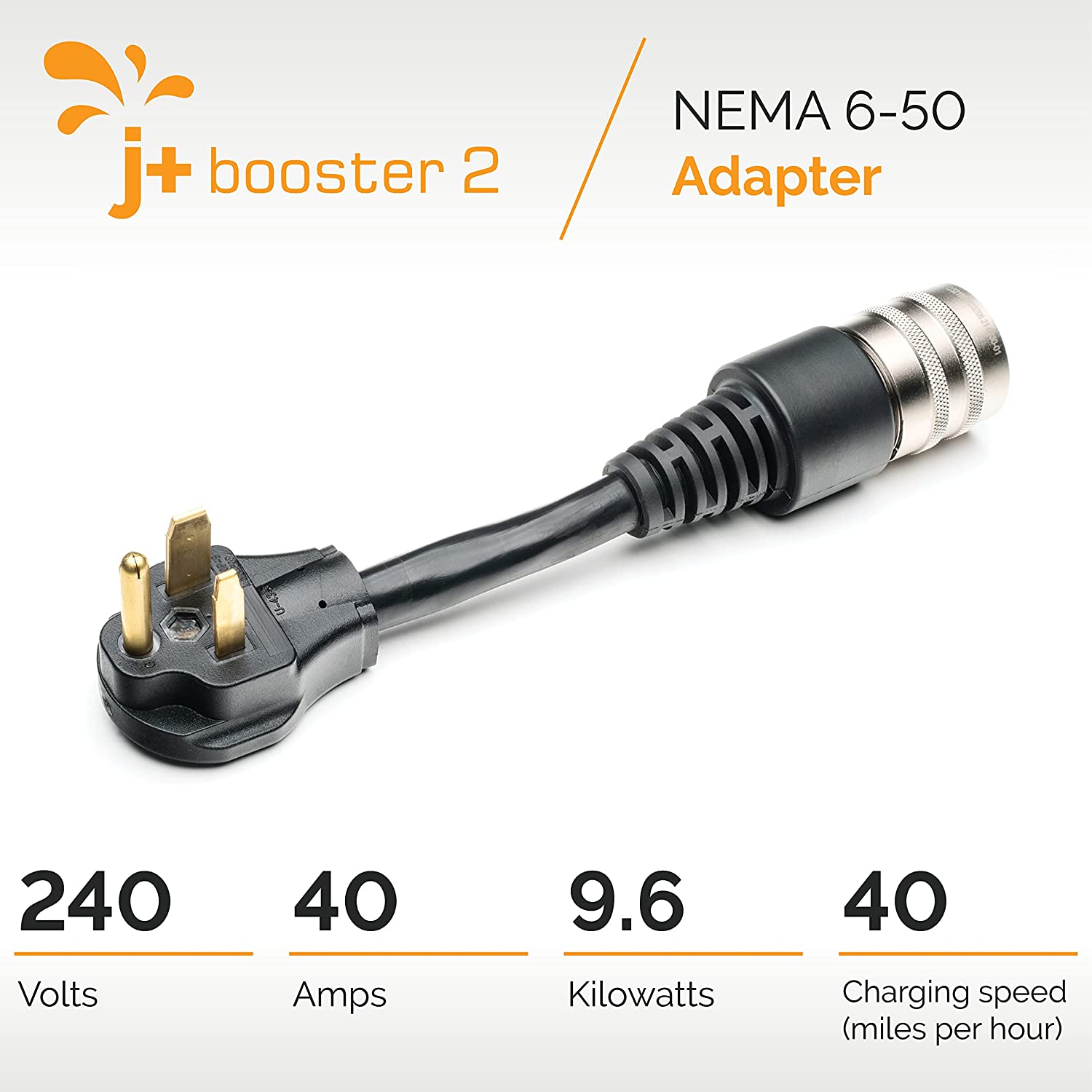 - Super-Fast 240V Electric Car Charger - Experience faster electric vehicle charging than standard wall outlets with a J+ Booster 2 EV charger. When paired with the NEMA 6-50 plug adapter it operates at 40 Amp, 240V and 9.6kW, with a 40 mph charging speed