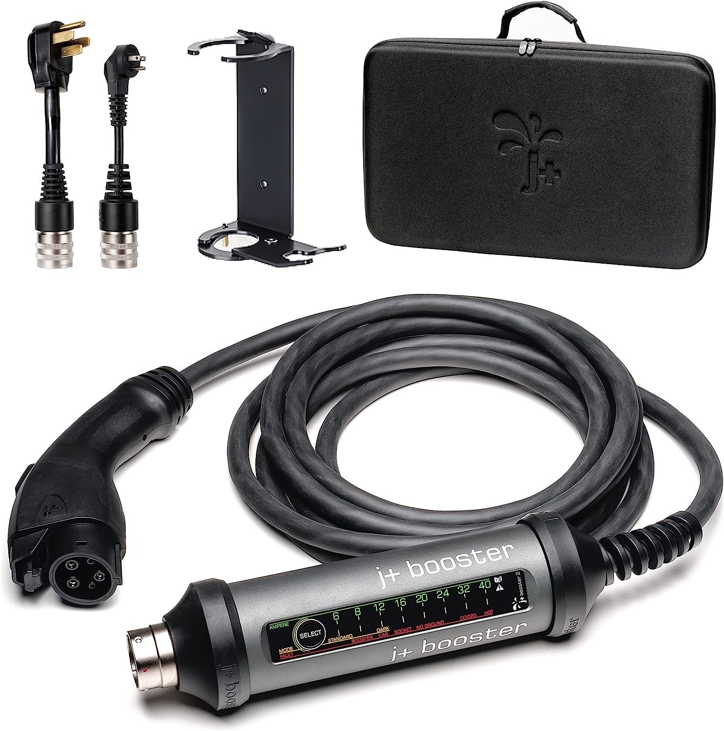 The J+ BOOSTER 2 is a portable Level 1 & Level 2 EV charger that can charge electric vehicles at home or on the go. It is compatible with all electric vehicles with a J1772 connector or adapter. The J+ BOOSTER 2 can charge your EV up to 7 times faster than a standard wall outlet.