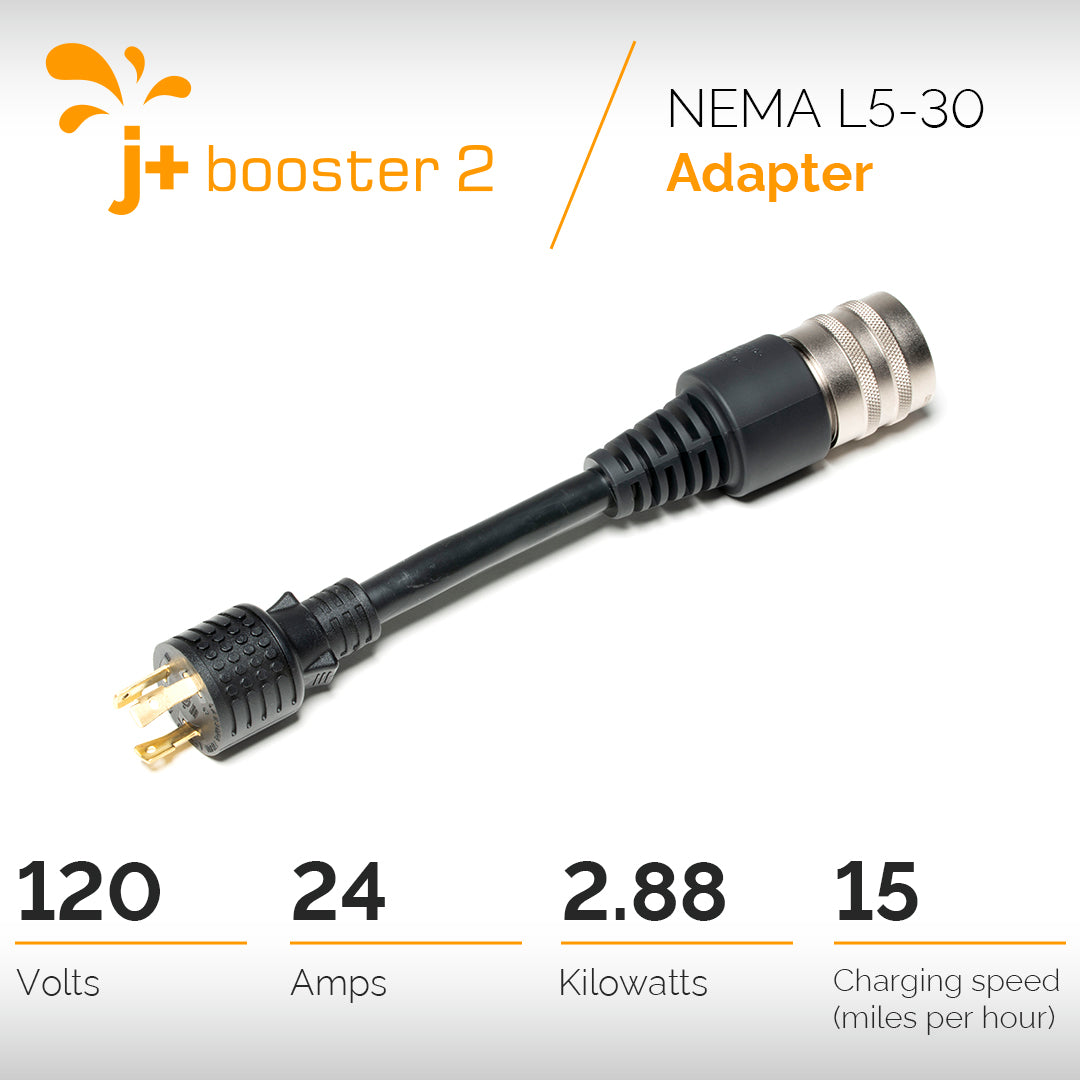 - Reliable 120V Charging Power - Achieve dependable electric vehicle charging with the J+ BOOSTER 2 and NEMA L5-30 adapter. Operating at 24 Amp, 120V, and 2.88kW, it delivers consistent charging performance for your EV needs.